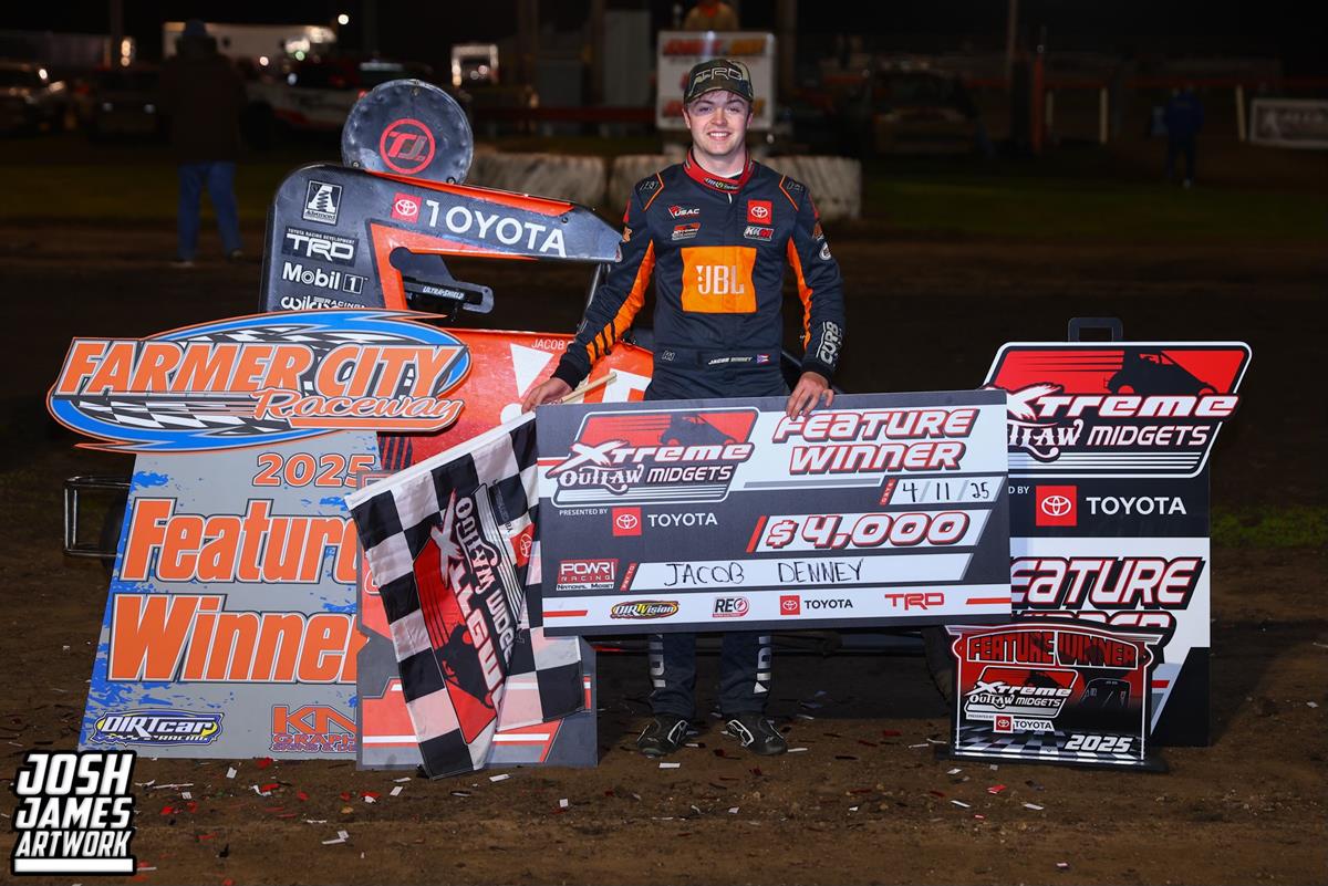 In Jacob Denney’s case, his memory will be of keeping veterans at bay to win his first career Xtreme Outlaw Midget Series presented by Toyota Feature at Farmer City Raceway Friday night.